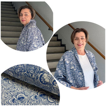 Aus dem wunderschönen Jacquard in Azurblau von Singuliere habe ich eine Kimonojacke genäht. Auch aus dem olivfarbenen Matlasse lassen sich leichte Jacken für den Übergang nähen.